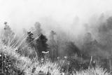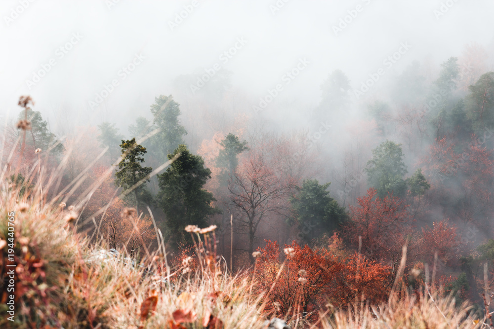 Beautiful autumn mountain landscape, trees in fog, in front of high dry grass