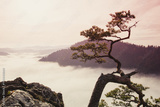 Fantastic mountain landscape, surreal pink and purple sky, the mountains are covered with trees, at the bottom of the valley filled with fog, on the foreground the tree grows from the rock