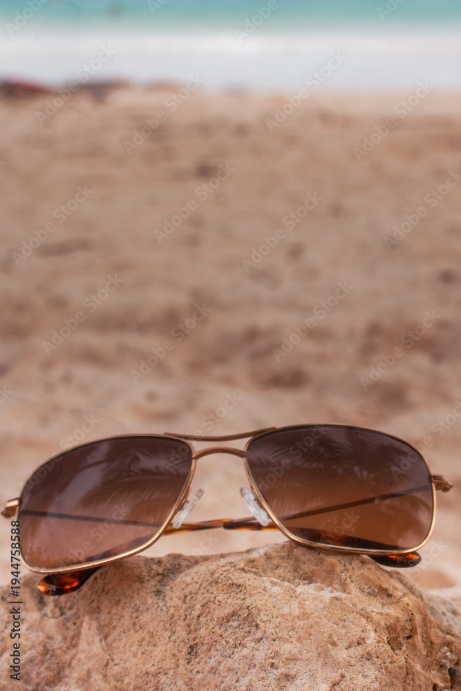 Sunglasses resting on a rock, capturing warm hues of a summer sunset over a tropical Bahamas beach, symbolizing relaxation, vacation, and travel memories