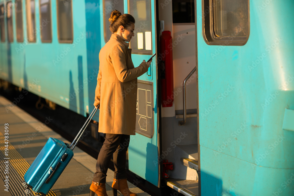 A woman in a tan coat uses her smartphone to scan a digital ticket at the entrance of a light blue train car, carrying her blue suitcase for a seamless journey.