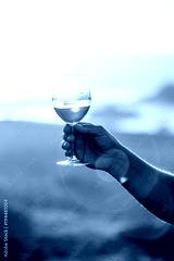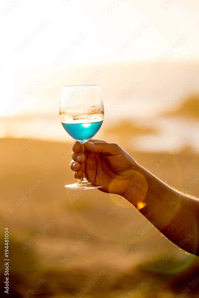 Mens hand holding glass of spanish blue with wine on sea ocean background