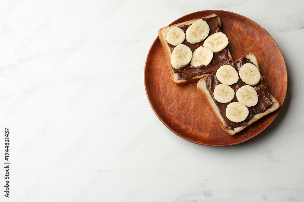 Toasts with chocolate paste and banana on white marble table, top view. Space for text