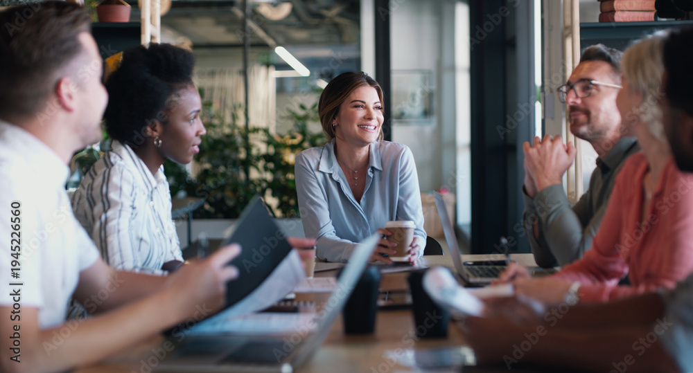 Woman, planning and team at startup for meeting in discussion, documents and happy with laptop at company. Person, group and brainstorming with writer, tech or review for project at creative agency
