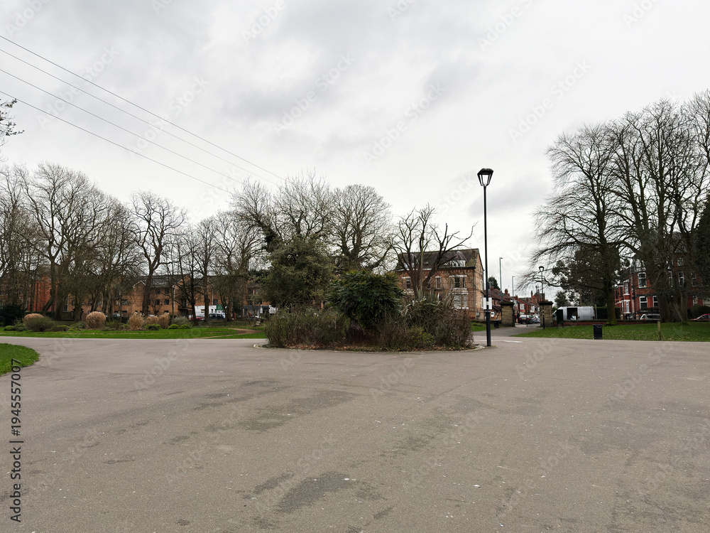 Empty overcast day in Alexandra Park Manchester UK with trees paths and surrounding residential buildings