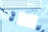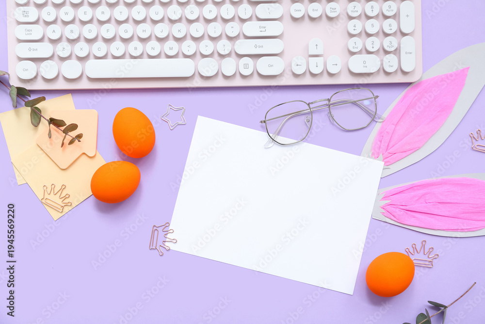 Composition with blank card, keyboard, stationery and Easter decor on lilac background