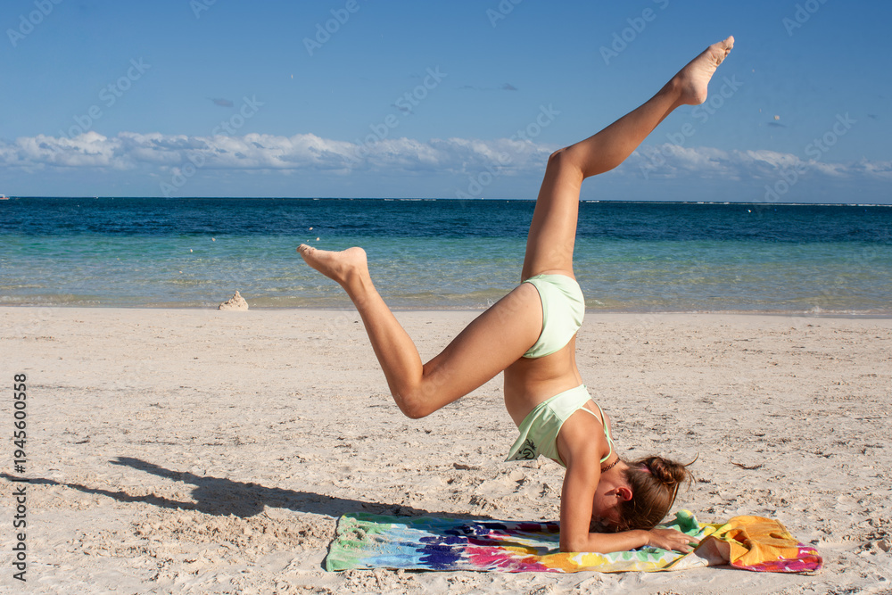Teenager practicing a headstand yoga pose on a tropical beach in Tulum, Mexico, enjoying a sunny summer vacation with the blue sea in the background