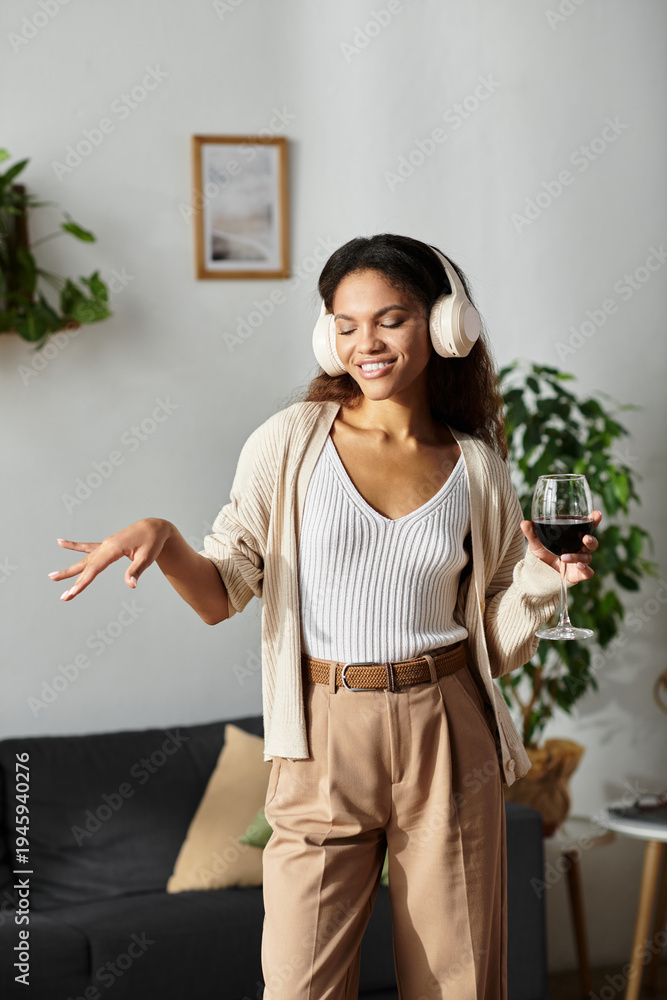 Joyful moments of a young woman enjoying music in her cozy living room