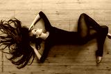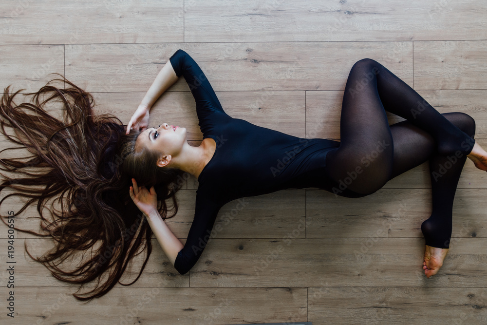 Beautiful young model ballet dancer lying inon floor. Top view.