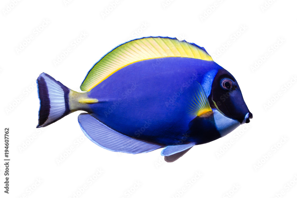 Marine fish on white isolated background with clipping path. Powder Blue Tang (Acanthurus leucosternon)