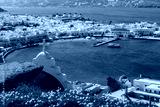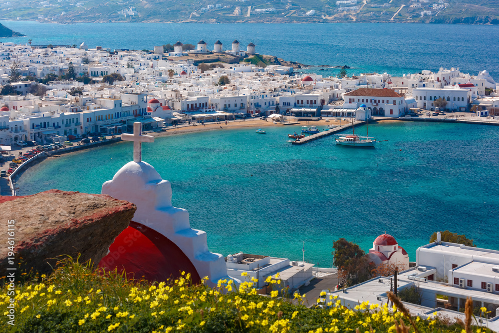 Aerial view of Mykonos City, Chora with Old Port, white houses, windmilles and churches on the island Mykonos, The island of the winds, Greece