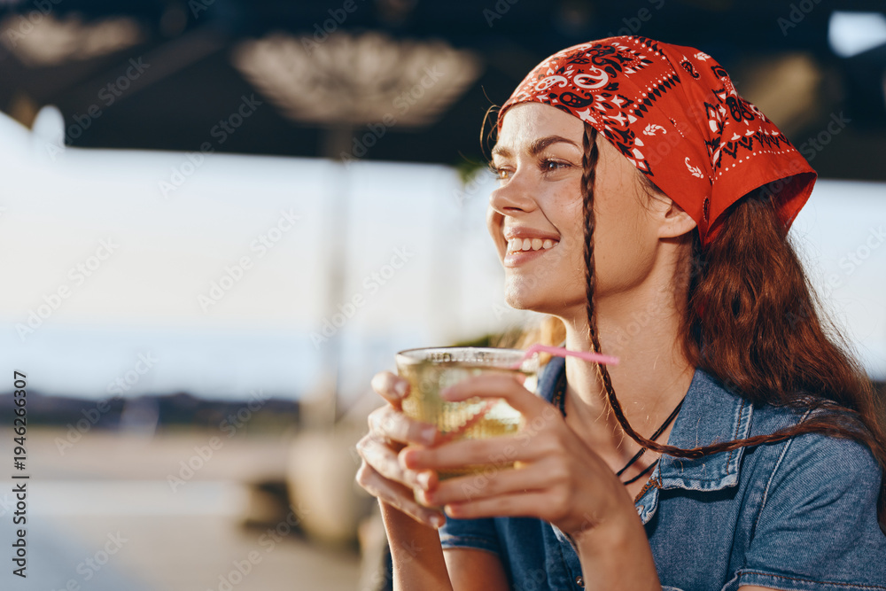 Lifestyle woman in modern boho-western denim street style enjoying a drink, smiling brightly with film color tones under natural sunlight outdoors.