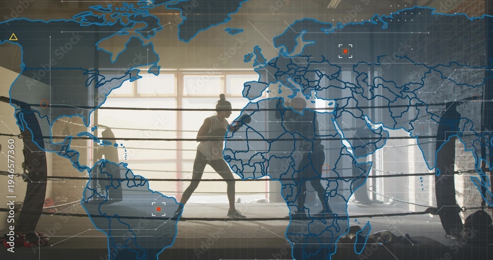Diverse training partners sparring in boxing ring with ropes at gym with gloves and map overlay