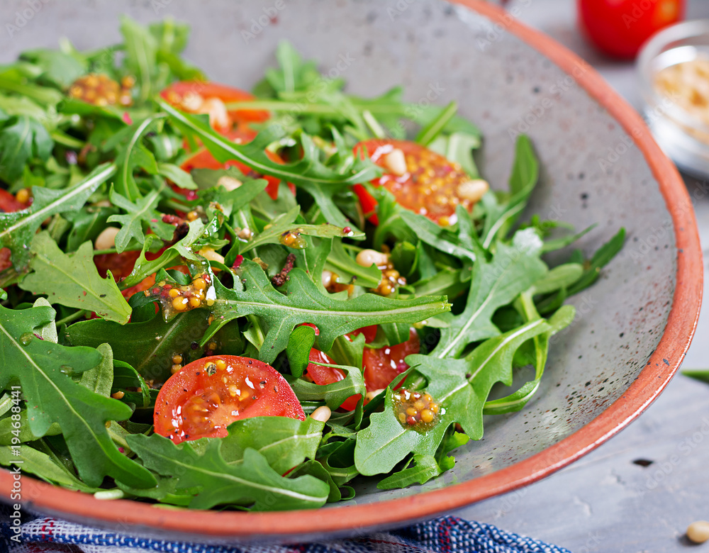 Dietary menu. Vegan cuisine. Healthy salad with arugula, tomatoes and pine nuts.