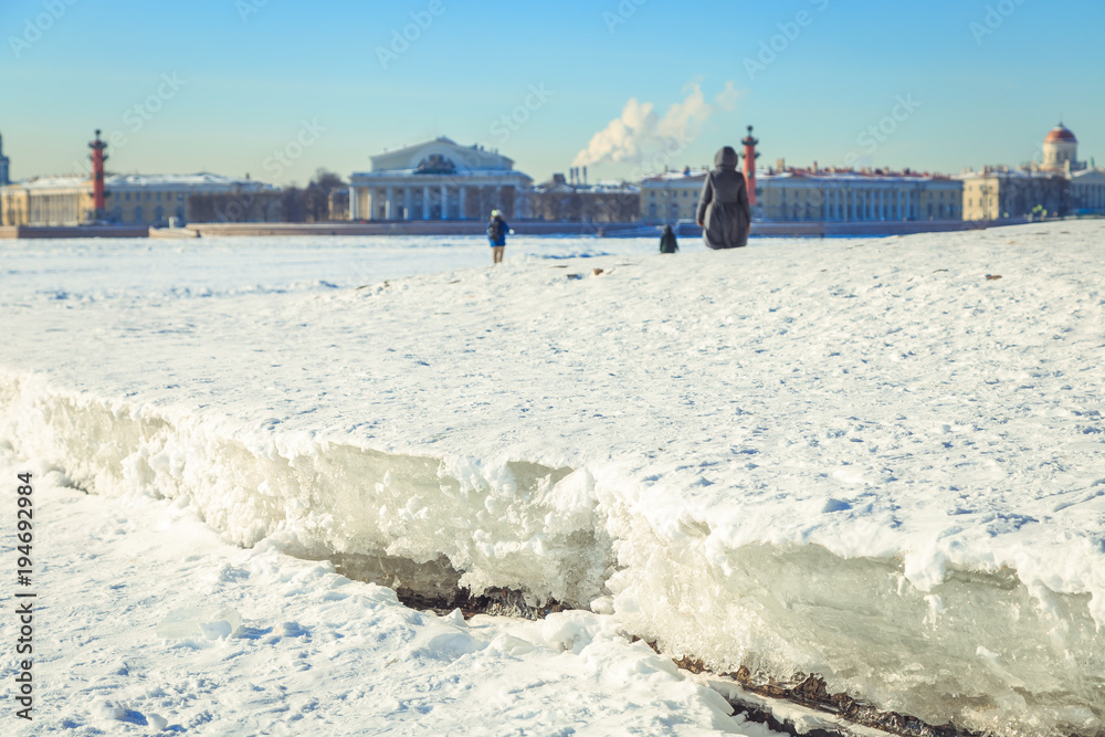 Panorama of the Spit of the Vasilyevsky Island in St. Petersburg on a winter sunny day