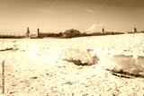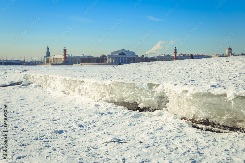 Panorama of the Spit of the Vasilyevsky Island in St. Petersburg on a winter sunny day