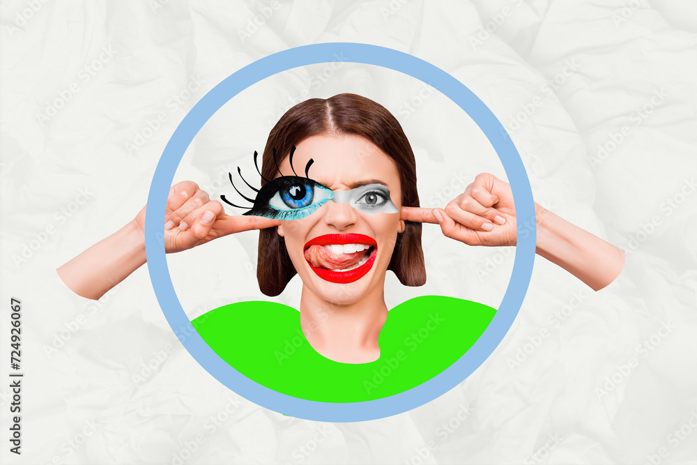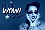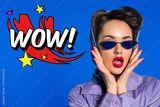 portrait of stylish woman in retro clothing and sunglasses with comic style wow sign isolated on blue