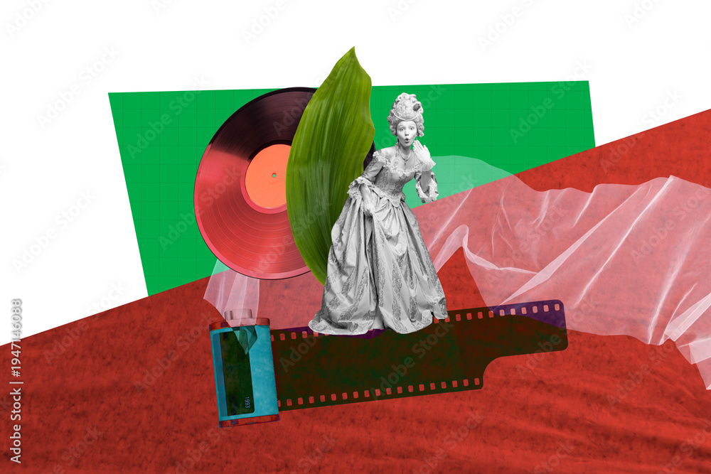 Exclusive art banner collage of shocked duchess girl stand retro tape vinyl disk music occasion weekend club party leaf plant