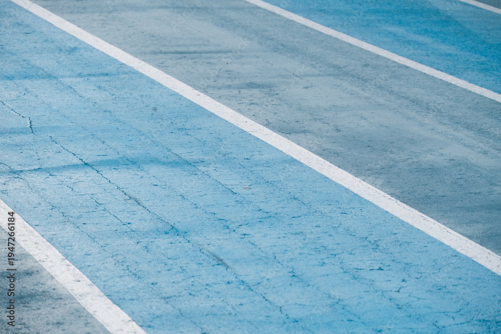 Blue and gray old running tracks with white lines outdoors.