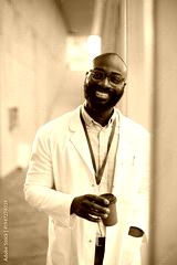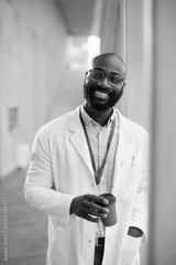 Happy black doctor with cup of coffee at medical clinic looking at camera.
