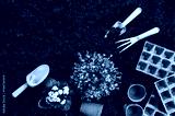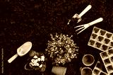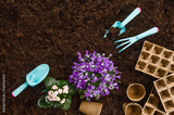 Gardening tools on fertile soil texture background seen from above, top view. Gardening or planting concept. Working in the spring garden.