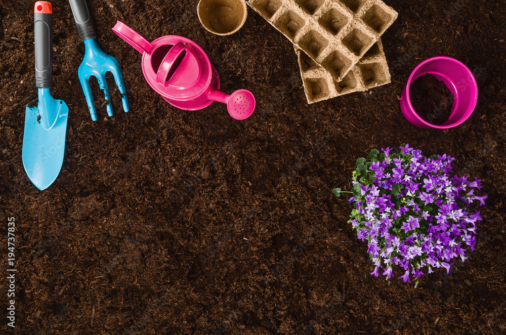 Gardening tools on fertile soil texture background seen from above, top view. Gardening or planting concept. Working in the spring garden.