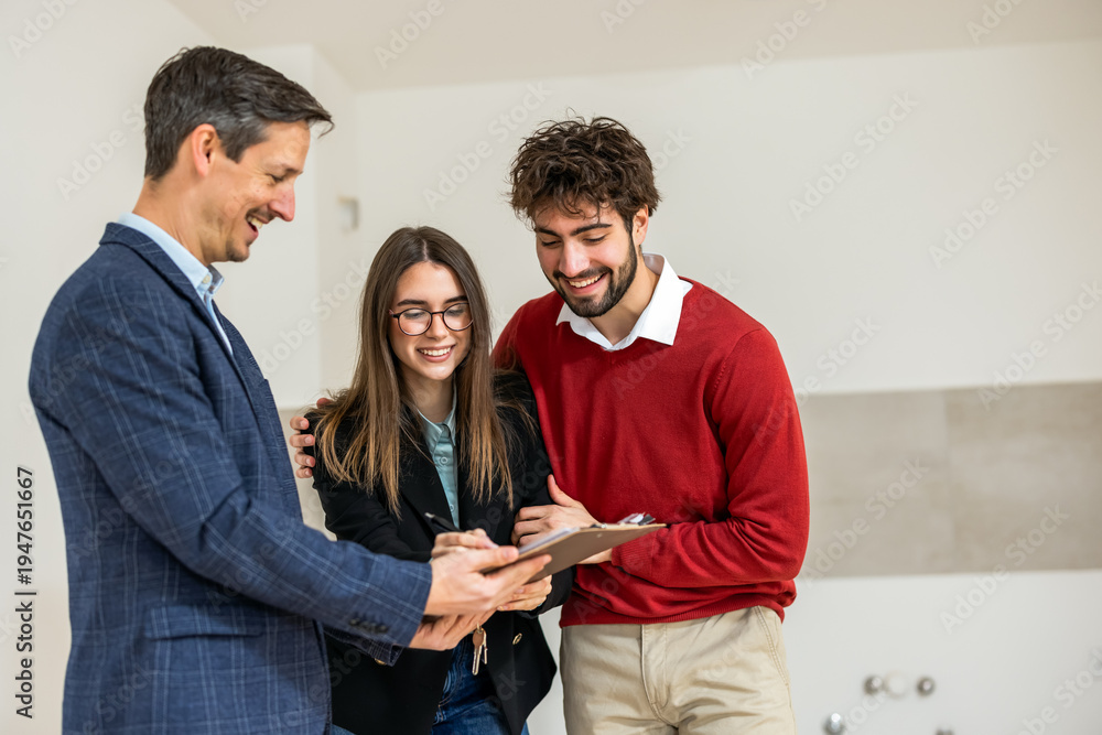 Young couple signing a real estate contract for a new apartment with an agent.