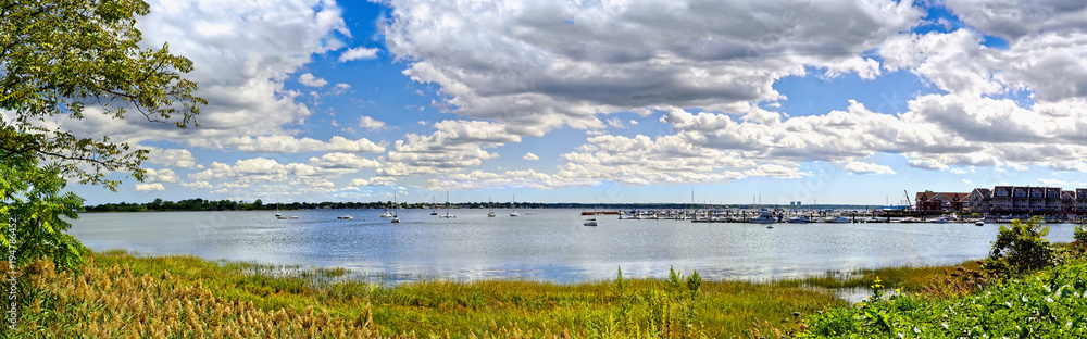 Panoramic view of Eastchester Bay in Pelham Bay Park, Bronx, New York City, USA