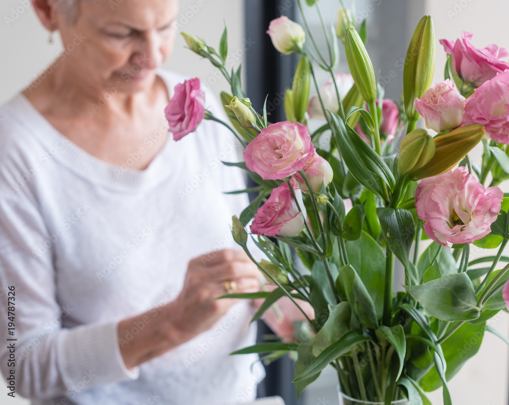 Older woman arranging pink lisianthus flowers with greenery in vase (selective focus)
