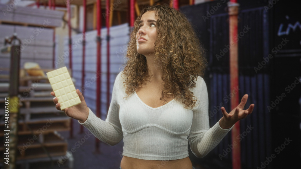 Woman holds white chocolate bar, palms up shrug with visible navel piercing in street; temptation confusion.