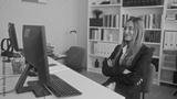 Woman in blazer typing with hands on keyboard at a desktop computer and looking at monitor in an office building; confidence career productivity.