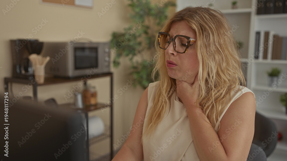 Woman touching throat with hand while seated at office building desk wearing glasses; work discomfort.