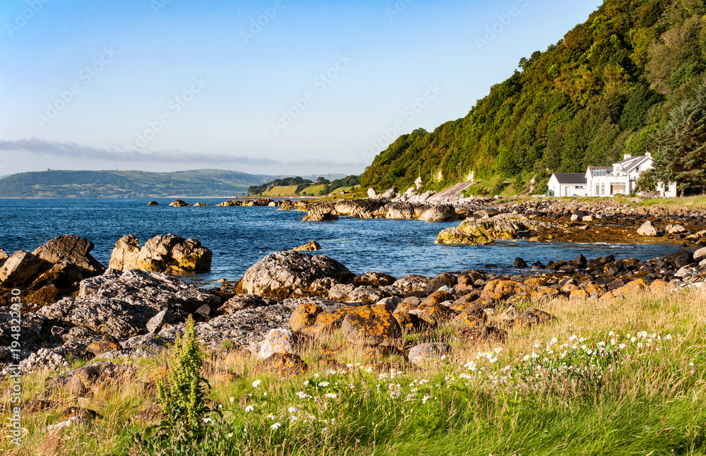 The eastern coast of Northern Ireland with rosks, stones and bays at Antrim Coastal Road, a.k.a. Causeway Coastal Route.