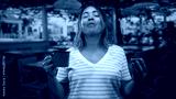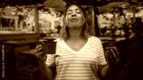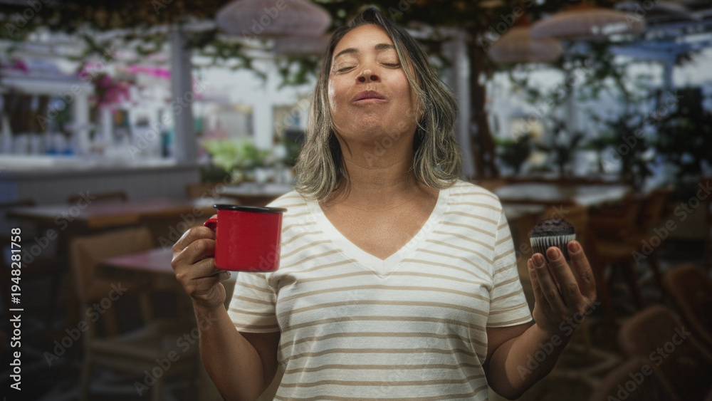 Woman holding red cup in right hand and chocolate muffin in left hand, smiling in a cafe building; simple joy.