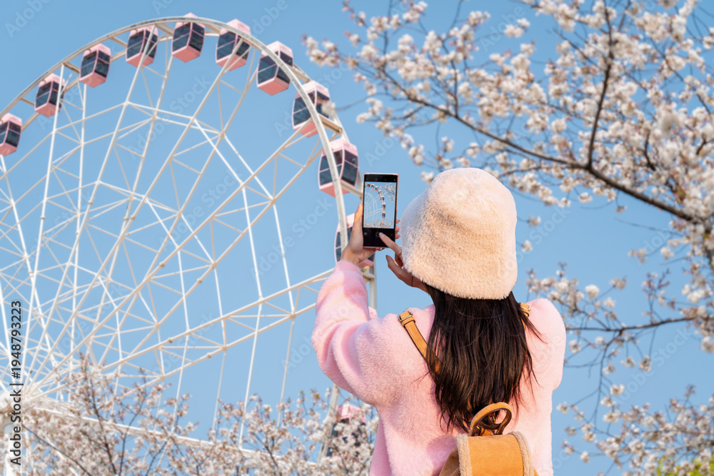 Young woman tourist taking photos of the ferris wheel with sakura cherry blossom blooming festival on a clear spring day