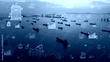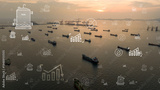 oil tankers anchored at sea with falling digital graphs. Global energy crisis, marine transport disruption, and fuel shortage concept due to war and Strait of Hormuz closure.