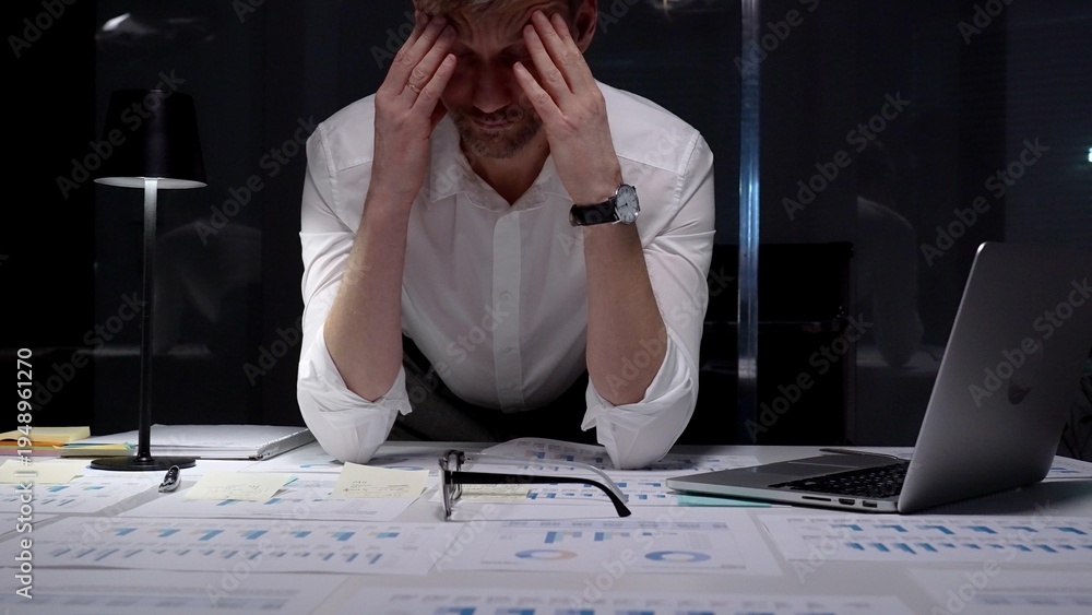 Stressed businessman suffering from overwhelming burnout and work overload, working late into the night, feeling frustrated with deadline pressure in a dark office environment