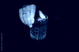 A man's hand with a wedding ring holds a crystal glass of vibrant red Negroni cocktail with an orange peel garnish against a dark, moody background
