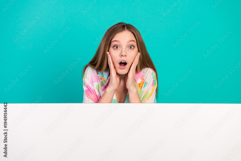 Surprised young woman with hands on face against a vibrant turquoise background, wearing a colorful shirt