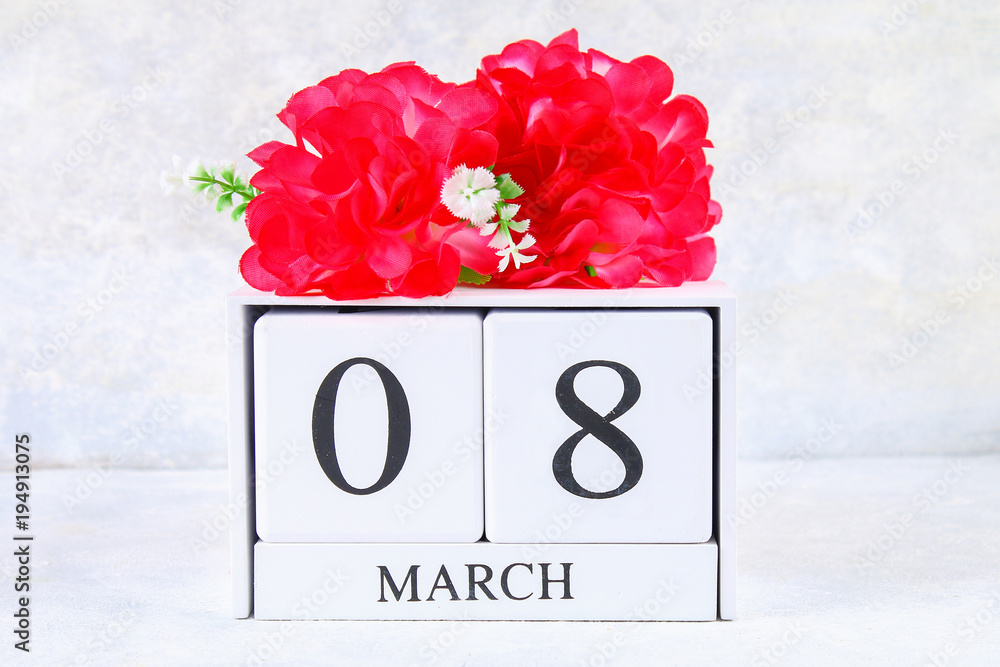 March 8, International Women's Day. Wooden perpetual calendar and pink flowers.