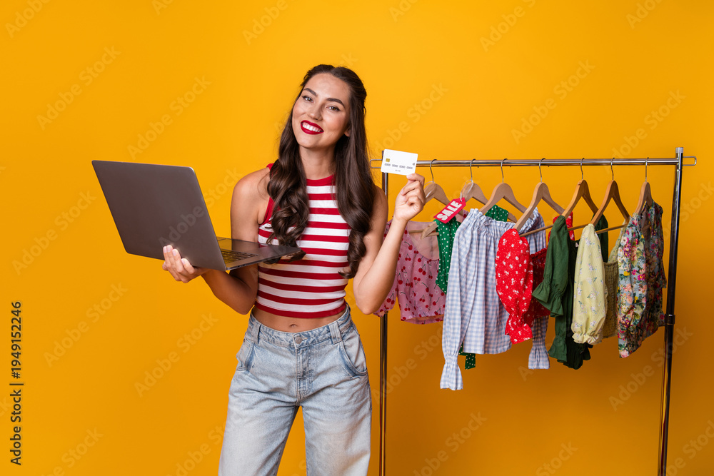 Young woman with laptop and credit card shopping for clothes on a bright yellow background