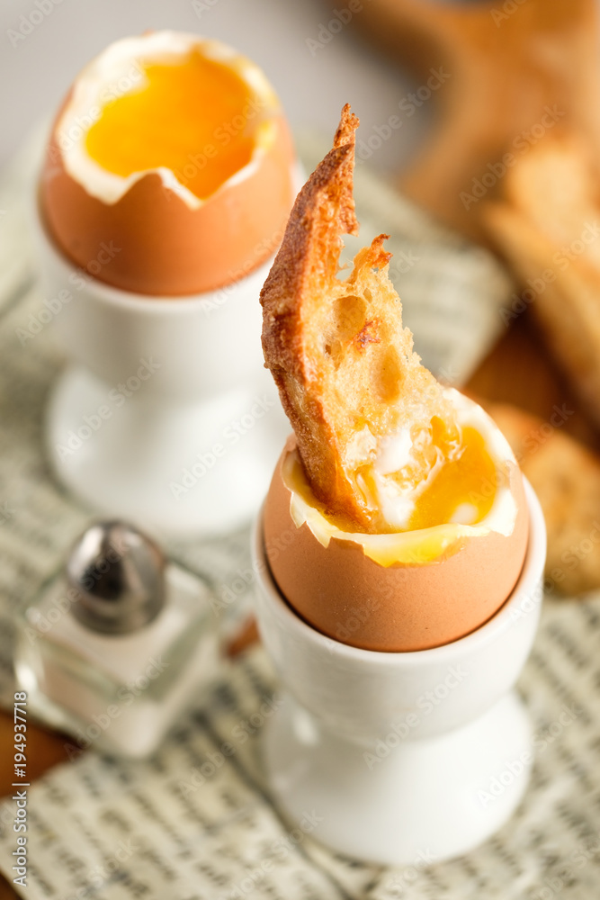 Soft boiled chicken egg for breakfast, with toast.