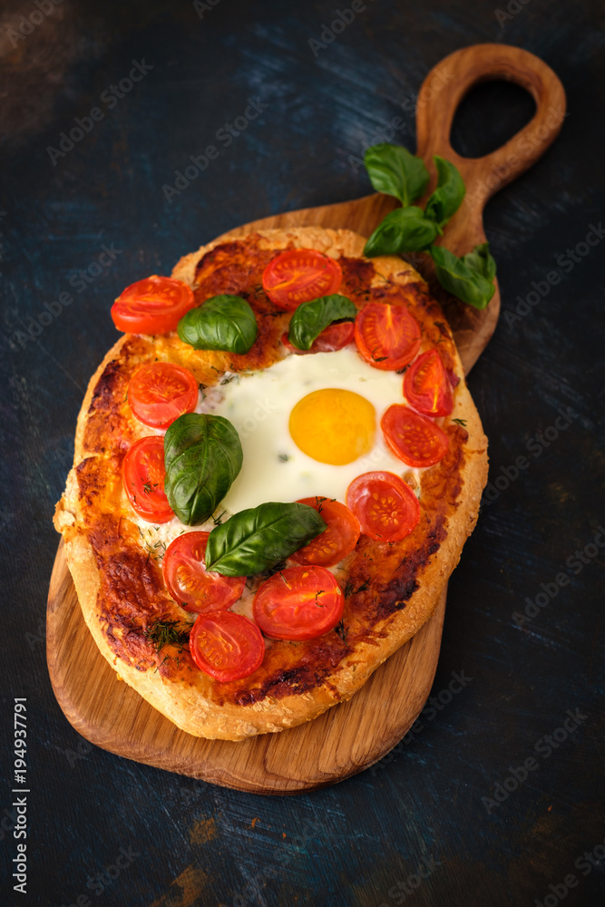 Homemade tasty pizza with egg, cheese, tomatoes and basil.
