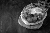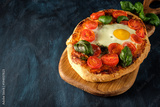 Homemade tasty pizza with egg, cheese, tomatoes and basil.