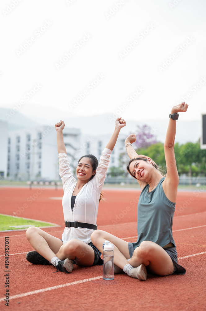 Asian woman and friend raising both hand stretching while sitting on running track in sports stadium
