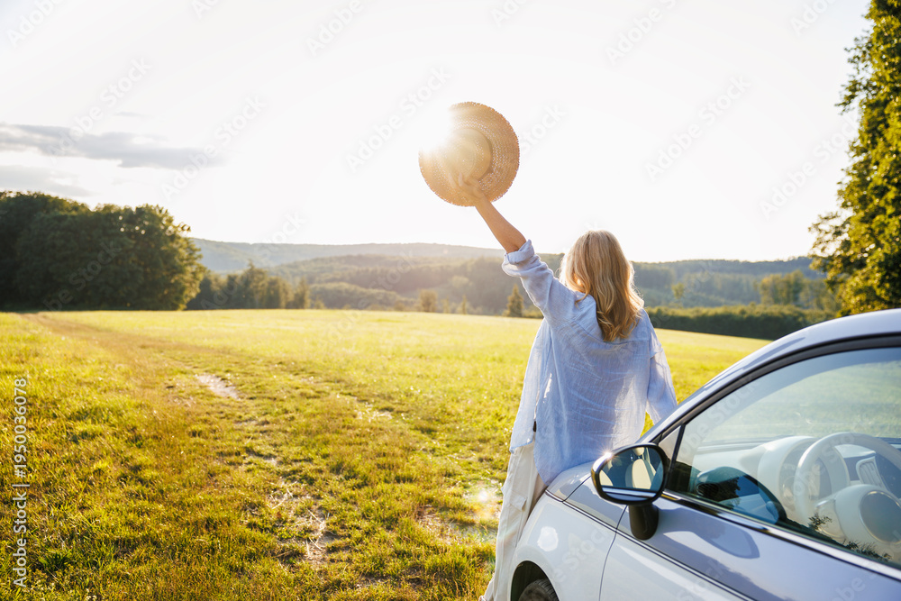 Carefree woman with hat standing by car during solo travel journey. Enjoyment of summer vacation road trip at sunset