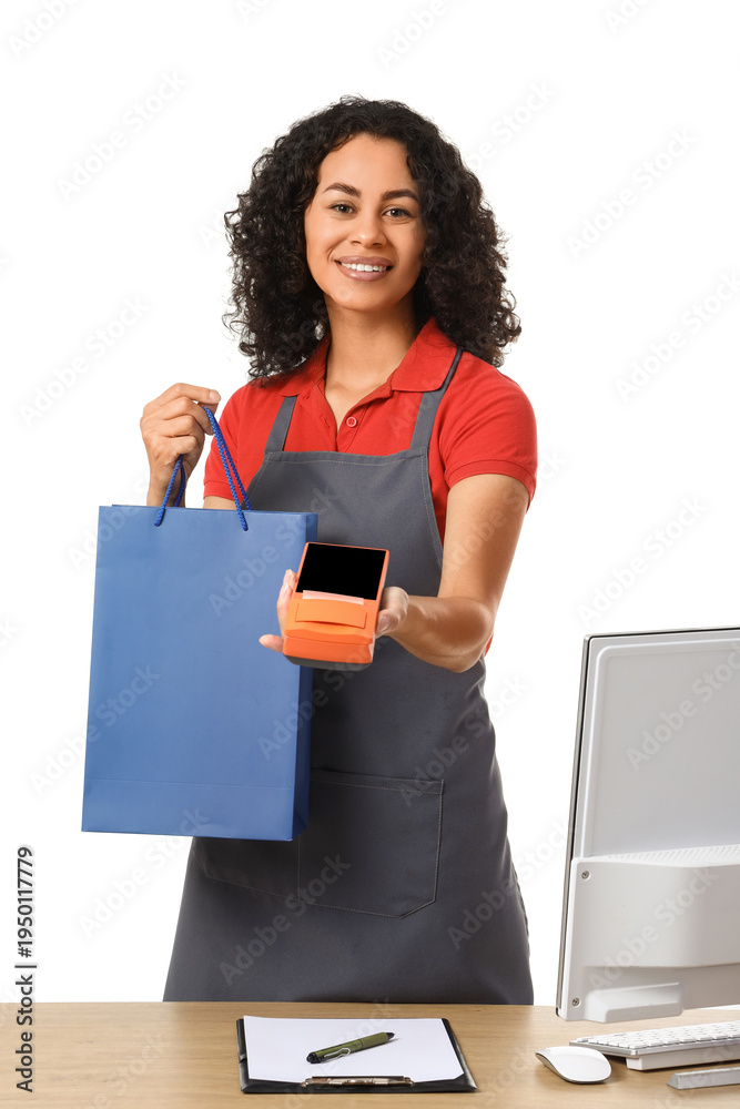 Female African-American cashier with payment terminal and shopping bag at checkout counter on white background