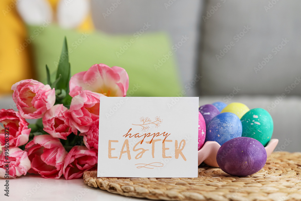 Easter eggs with greeting card and beautiful tulip flowers on table in festive living room