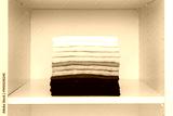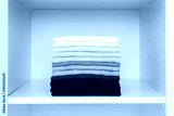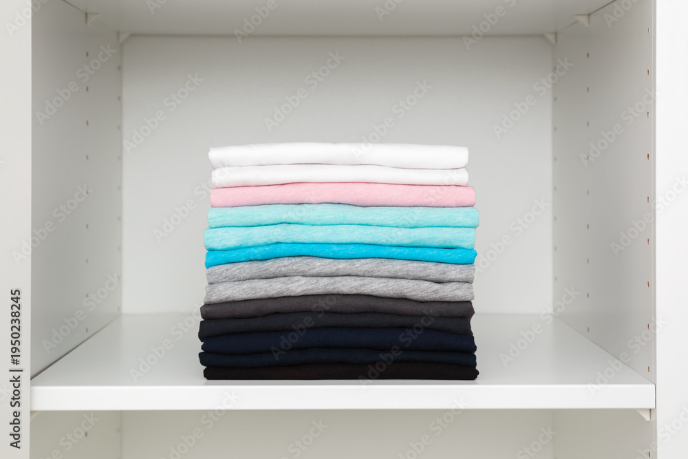Folded colorful t shirts in white opened wardrobe at home room. Different male clothes. Closeup. Front view.