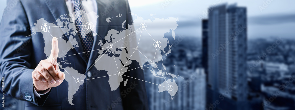 A businessman in a suit interacts with a digital world map overlay, illustrating global connectivity, international business networking, and communication technology against a city background