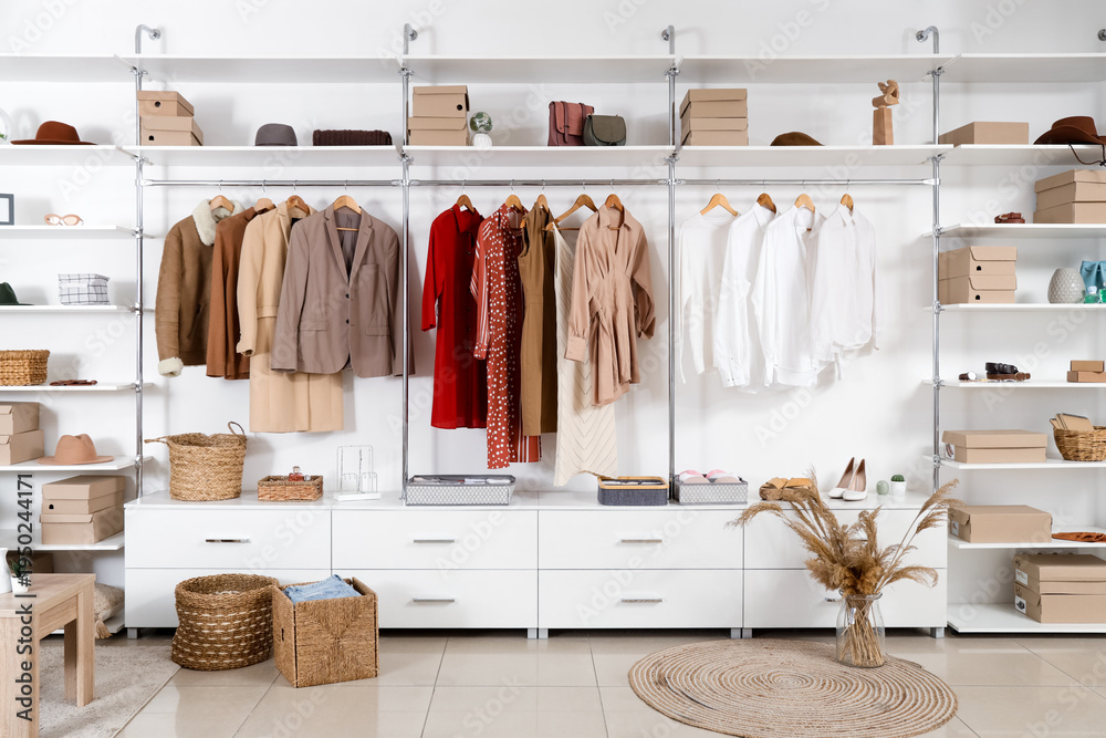 Big wardrobe with different stylish clothes and accessories in dressing room